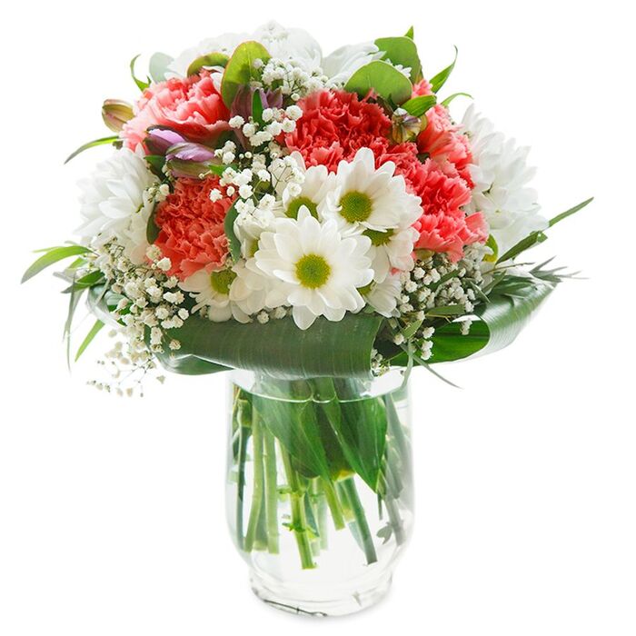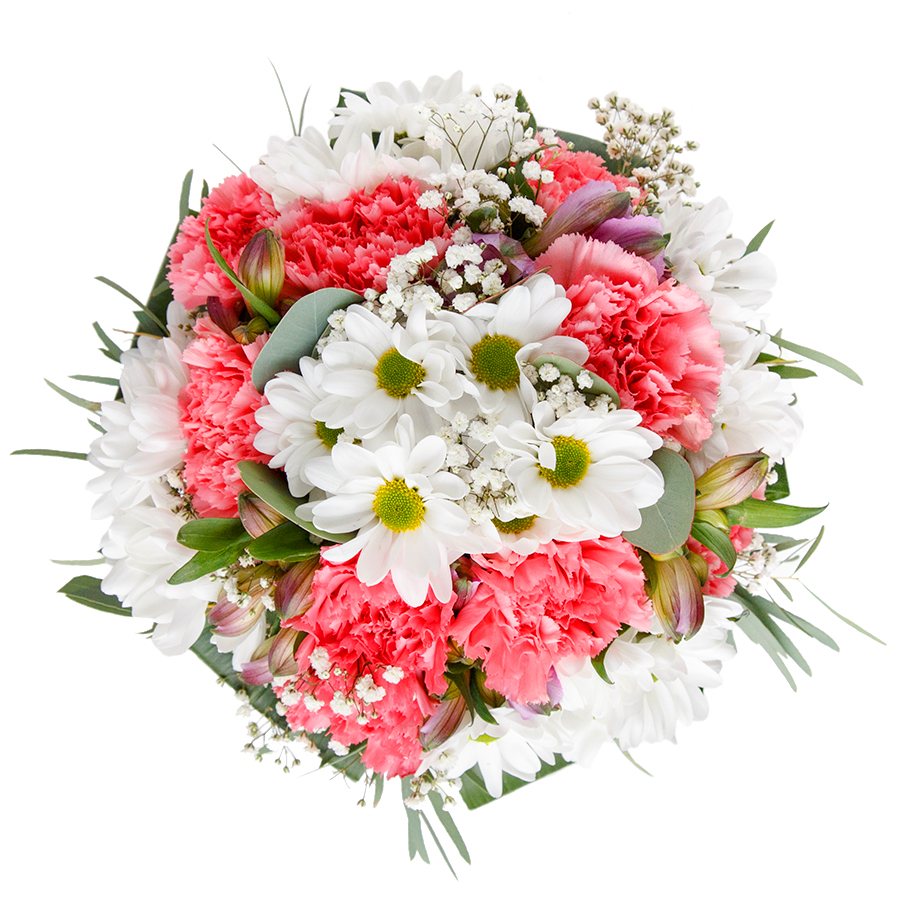 Enhance any occasion with our Elegant White & Pink Floral Arrangement. This unique bouquet features a harmonious blend of snow-white chrysanthemums, soft gypsophila, and light pink carnations, all beautifully arranged with rich aspidistra leaves to create a stunning display.